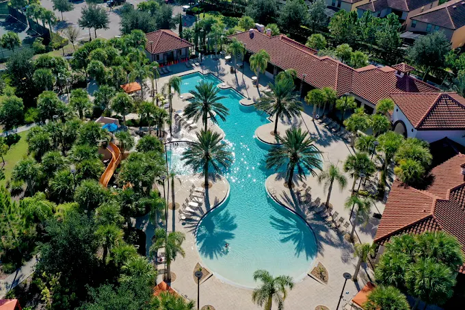 Solterra Resort in Davenport is a gated, family-focused vacation community offering modern homes alongside full resort-style amenities. Centered around a zero-entry pool, lazy river, and signature waterslide, it delivers fun for all ages while maintaining a secure, relaxed environment. Guests can enjoy Café Sol Bar & Grill, a vibrant clubhouse, outdoor sports, and scenic walking trails, with private villas featuring screened pools and spas for additional comfort. Important 2026 notes: waterslide riders must be at least 48 inches tall, the lazy river and slide operate on seasonal hours, and a one-time household amenity fee is required for access to the clubhouse, pool, and fitness facilities. Amenities: